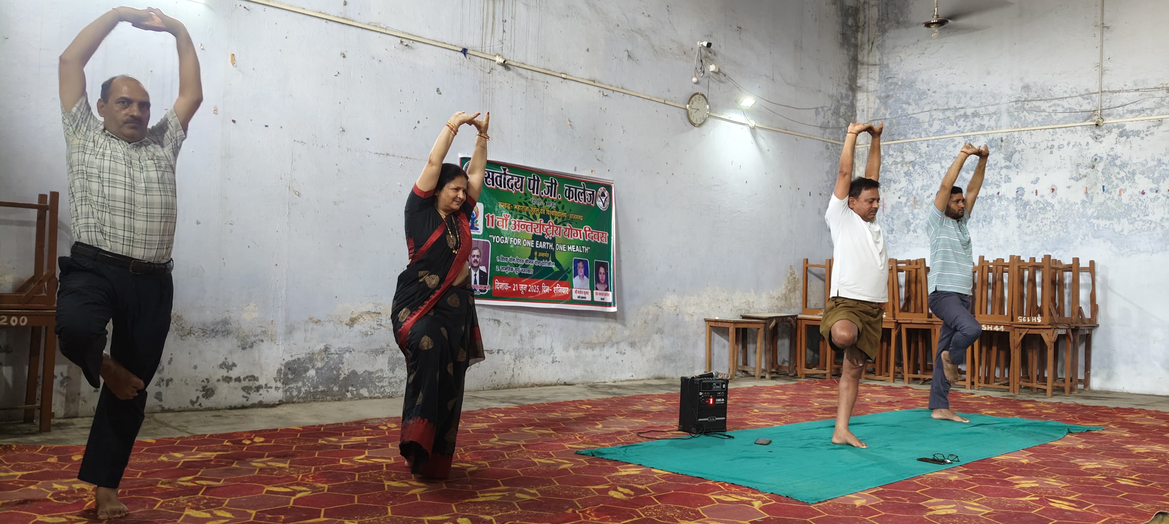 सर्वोदय पीजी कॉलेज घोसी,मऊ के प्रांगण में 21 जून को भारत सरकार एवं उत्तर प्रदेश सरकार के संयुक्त निर्देशानुसार अन्तर्राष्ट्रीय योग दिवस पर योग शिविर का आयोजन योग प्रशिक्षक श्री मनोज गुप्ता वैध जी के प्रशिक्षण मे आयोजन किया गया। इस अवसर पर योग अभ्यास भी किया गया जिसमें सूर्य नमस्कार 12 मंत्रो के साथ तथा प्राणायाम के बारे में बच्चों को बताया गया इसके पश्चात योग दिवस के अवसर पर योग संगोष्ठी का आयोजन भी किया गया उसमें योग के लाभ के बारे में बच्चों को बताया गया तथा जागरूक किया गया इस मौके पर महाविद्यालय की प्राचार्या प्रो. वंदना पांण्डेय, मुख्य अतिथि कृषि विभाग के प्राध्यापक डॉ. दिनेश कुमार सिंह (नेशनल पीजी कॉलेज बड़हलगंज), प्रो. नलिन मिश्रा (टी.डी कॉलेज जौनपुर), तथा कॉलेज के प्राध्यापक श्री अजय मिश्रा, श्री नितिल कुमार श्रीवास्तव, श्री अमरनाथ जयसवाल, श्री चंदन कुमार मिश्रा, श्री संजय चौरसिया, श्री राहुल कुमार त्रिपाठी, श्री रामभुवन यादव, श्री महेश बाबू व संजय यादव, योगेश कुमार, मनोज मौर्य, व सभी छात्र व छात्राएं उपस्थित रहे।आयोजित कार्यक्रम के अन्त में वैदिक मंत्रोच्चार के साथ राष्ट्गीत, राष्ट्रगान , का सस्वर वाचन किया गया और अन्त में महाविद्यालय की प्राचार्या जी ने योग के महत्व पर प्रकाश डालते हुए शिविर के प्रशिक्षक मनोज गुप्ता वैध जी को एवं सभी सहभागी जनों को धन्यवाद ज्ञापित की |